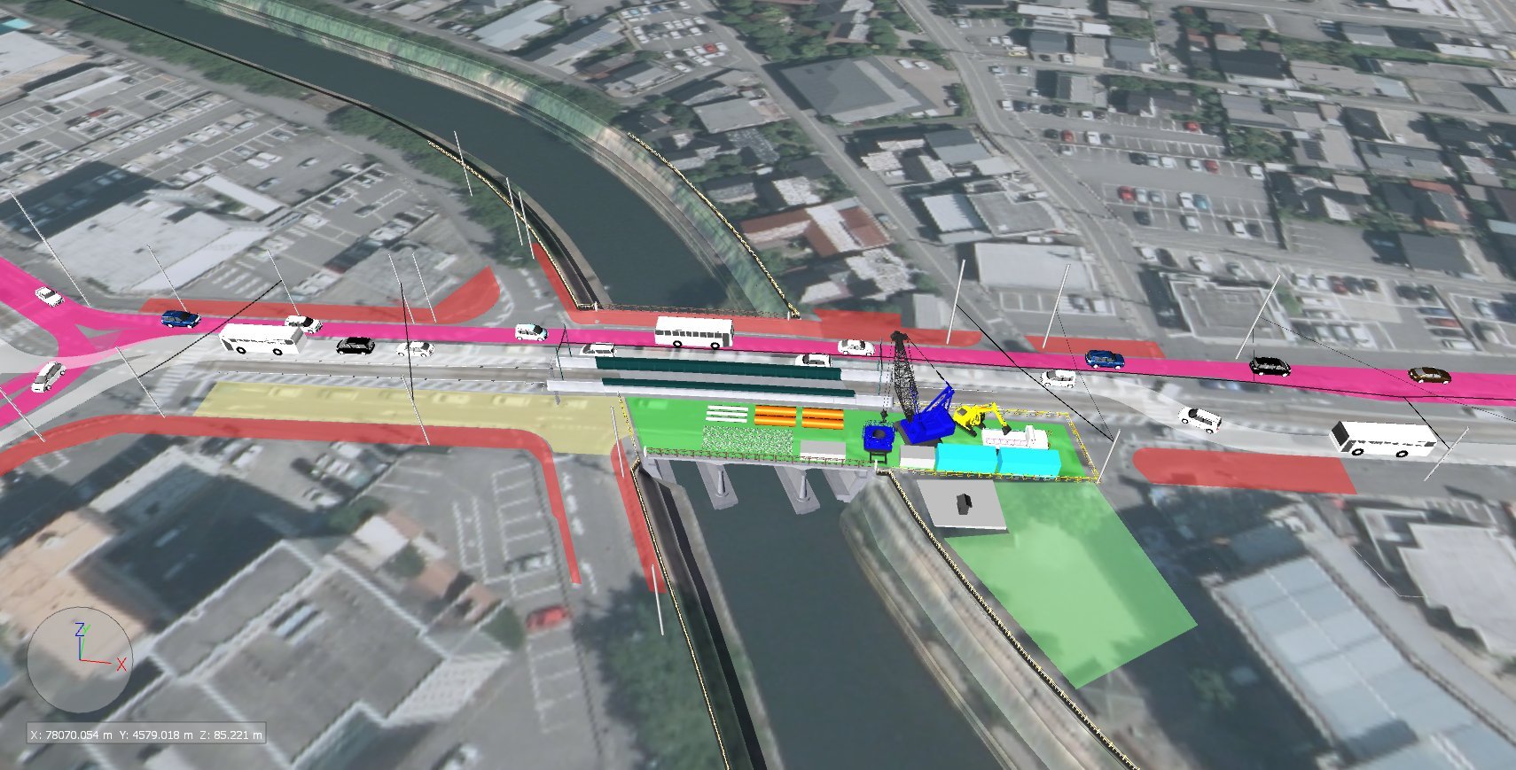施工にも活用(ヤード配置と区域、交通の切り回しステップ、建築限界の照査と施工機械の選定、架設の検討、現場作業員への説明周知など)
