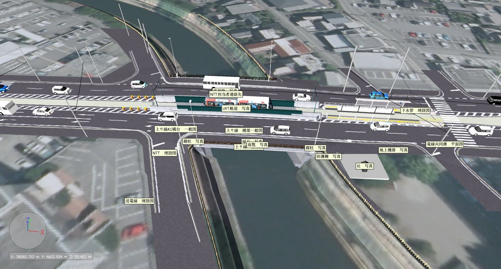 行政が行う維持管理業務の効率化も考慮し、過去の維持管理データをリンクさせて、近年増加傾向にある自然災害に対しても迅速な対応ができるようにBIM/CIMデータを構築しました。